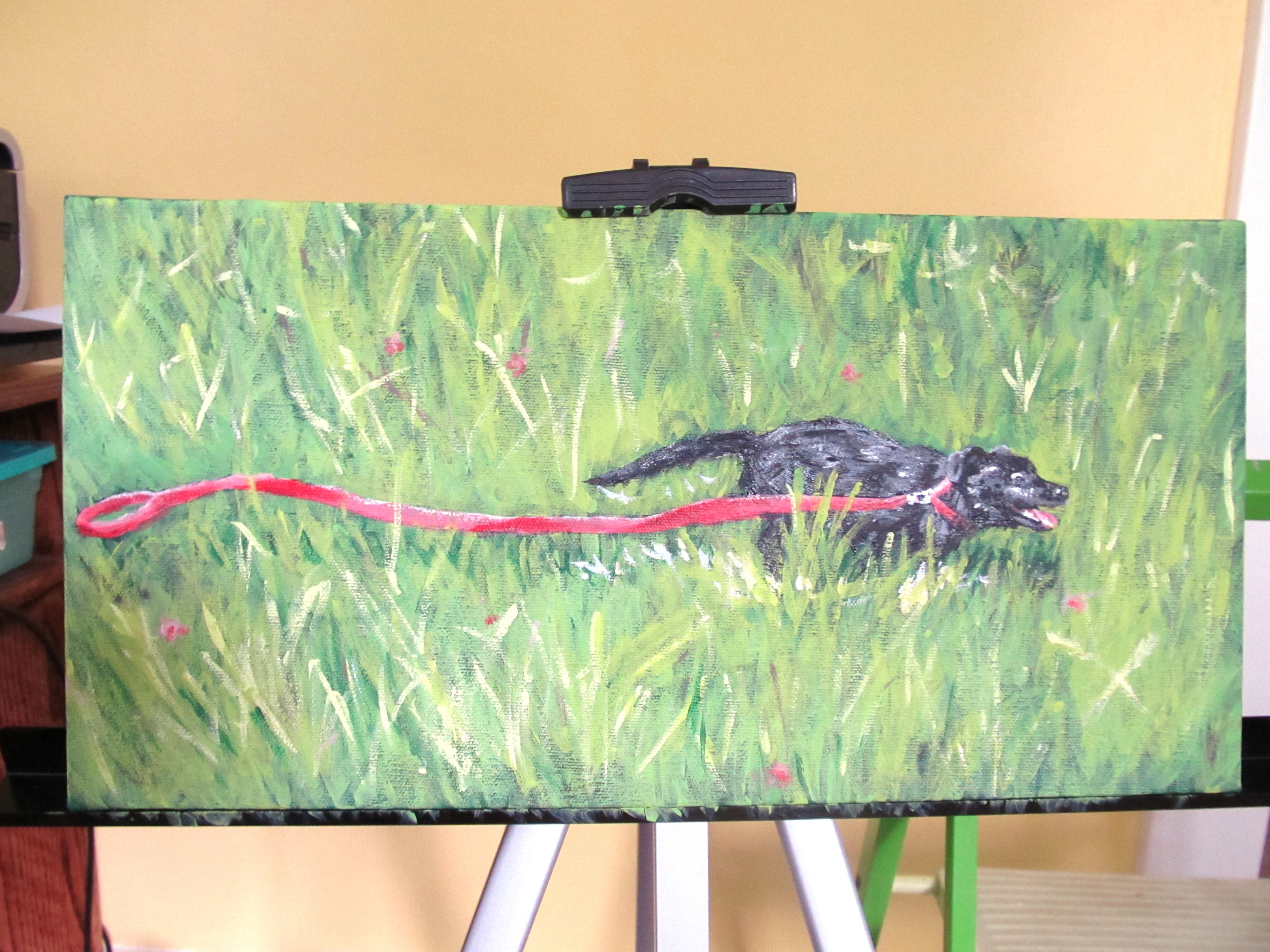 Wild Thing May 10, 2012 boomchuckpixyniki Acrylics on 8×16″ stretched canvas. Source: photo from 2009 of the moment my dog Sassy, a lab-mix, first encountered water in a ditch.