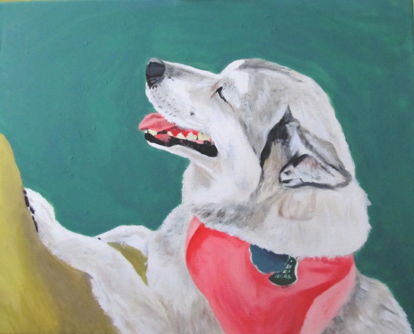 Remembering Sassy the Second May 10, 2012 boomchuckpixyniki Acrylics on 16×20″ stretched canvas, June 2011. In memoriam of my late dog Sassy, who crossed the Rainbow Bridge in May 2008. Her legacy and name live on in my current dog, who, like her predecessor, lives up to her name.