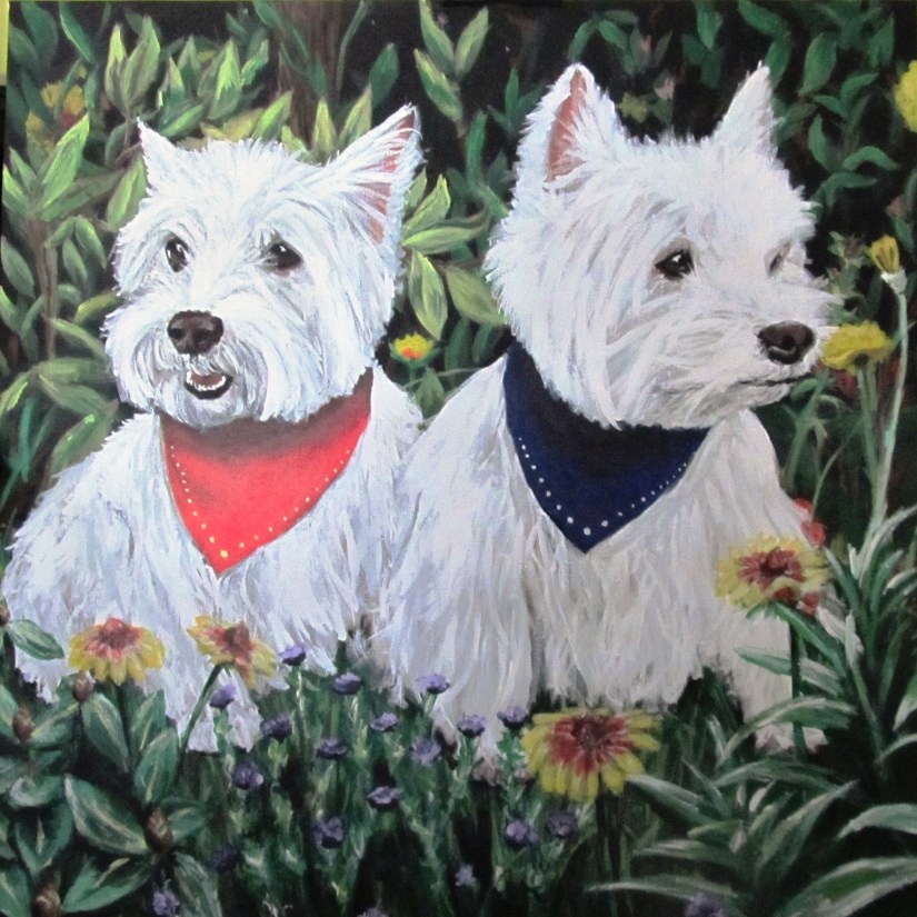 Westies Portrait May 10, 2012 boomchuckpixyniki Memorial portrait of West Highland Terriers Fancy and Grumpy. Acrylics on 24×24″ stretched canvas. Summer 2011.